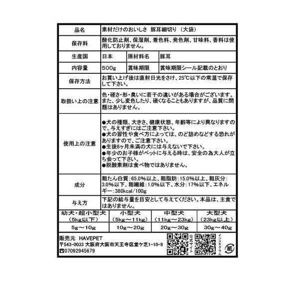 【大袋単品】豚耳細切り500g 犬のおやつ 無添加 HAVEPET 犬用品